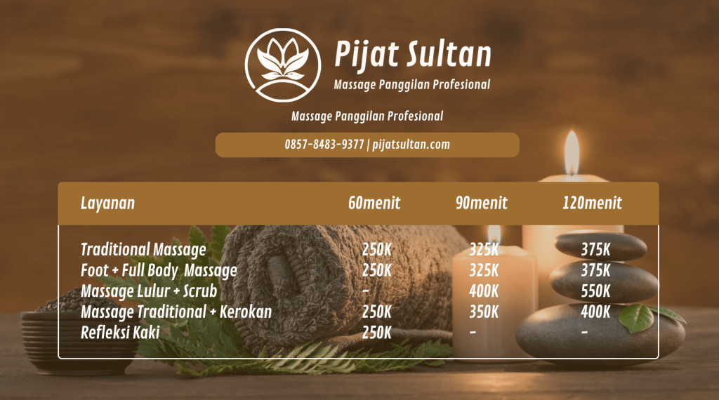 Pijat Sultan merupakan layanan massage panggilan profesional dengan pengalaman yang mumpuni di bidang massage. Pijat Sultan memberikan layanan pijat antara lain Pijat Refleksi, Massage Tradisional, Terapi Bekam, Totok wajah, Pregnancy Massage, Pijat Kerik, Body Scrub, Massage Cedera, dan Therapy VM.